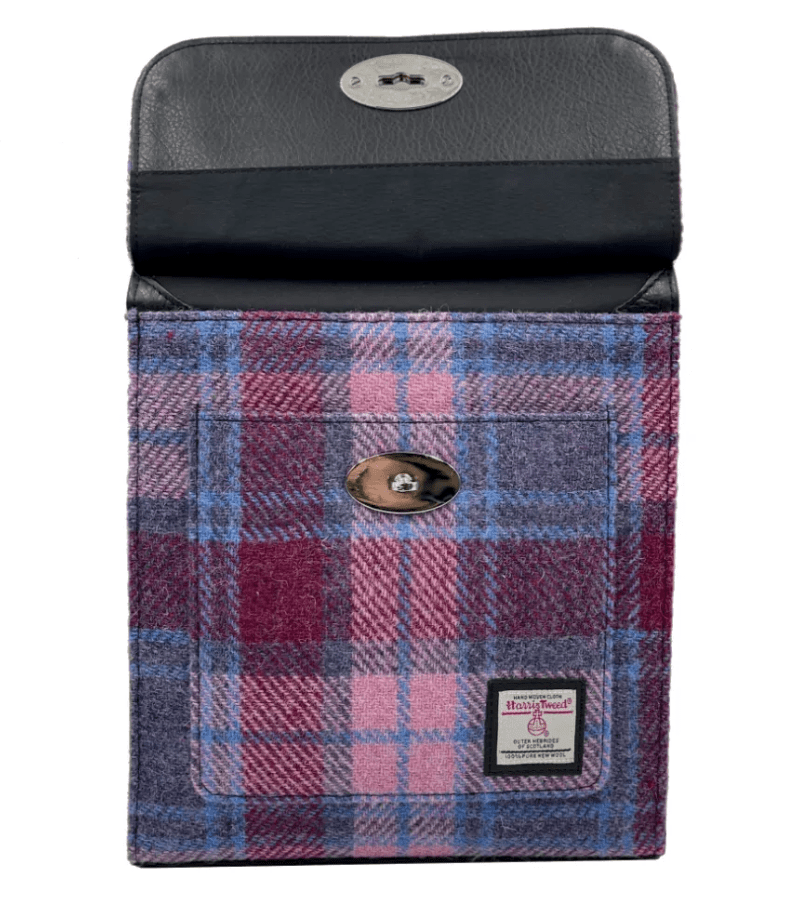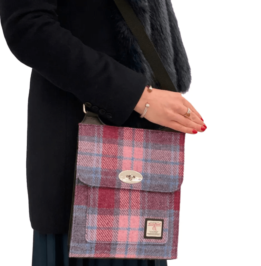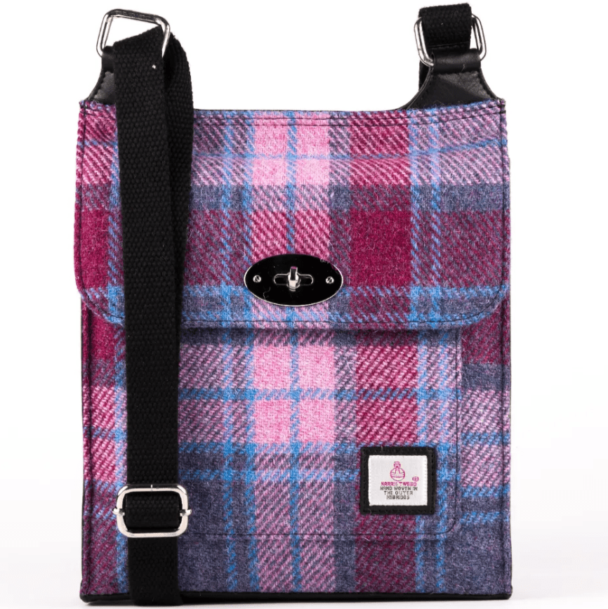 Stylish and elegant, this Maccessori Harris Tweed Pink and Blue Tartan Satchel Bag is the perfect take everywhere bag! This beautiful tweed is handmade in Scotland in the north western Isles of the Outer Hebrides, where it has been traditionally made for centuries. This slim, fully lined bag features an adjustable cross body strap, reverse zip pocket, open front pocket (covered by the fold over flap for extra security!), and two interior side pockets to keep everything organized. Finished with a turnkey latch closure, it's the ideal bag to hold all of your essentials while not getting in the way of your little life adventures!